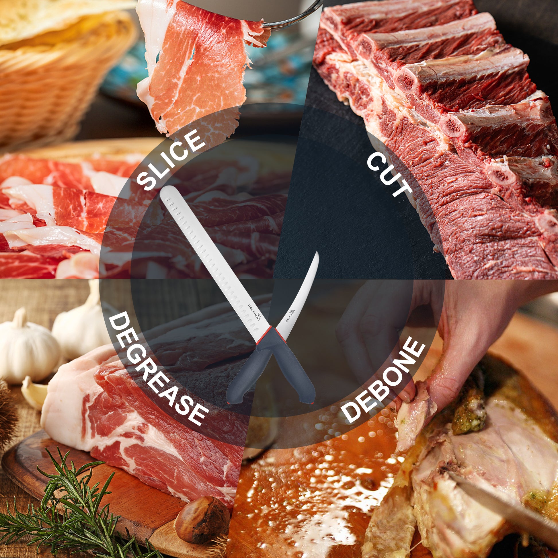 - PROFESSIONAL SLICER KNIFE: 12-inch blade design, slender blade can achieve more precise cutting, the advantage of the long knife is that you can cut one piece at a time, easier to use. The blade's air holes prevent food from sticking to the blade, and its narrow blade means it creates less resistance when cutting food, resulting in a cleaner, more even slice.