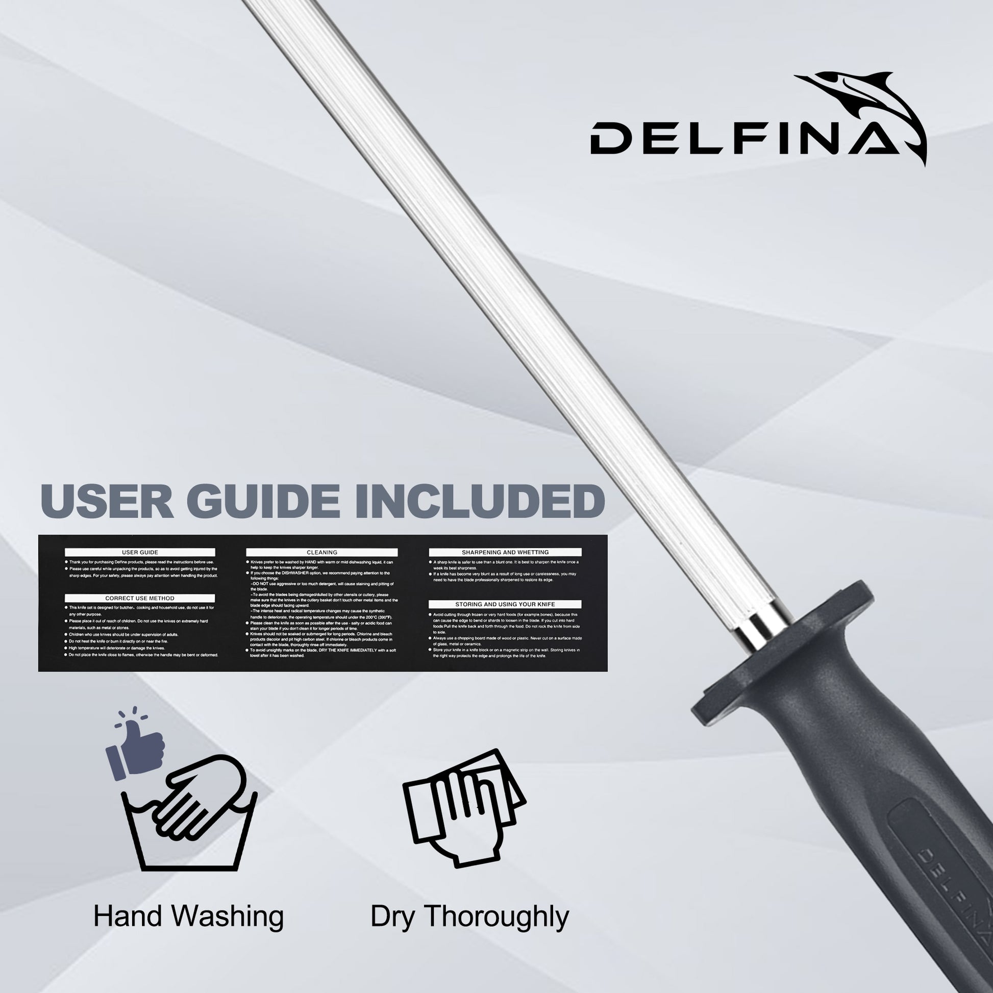 - DELFINA 10" Knife Sharpener Rod: Fabricated from high carbon steel to keep cutlery sharp and operating at peak performance. Easy to store with ring for hanging as well as elaborated hand protection. Please DO NOT put in the dishwasher, just by hand washing and wipe clean with a damp cloth.