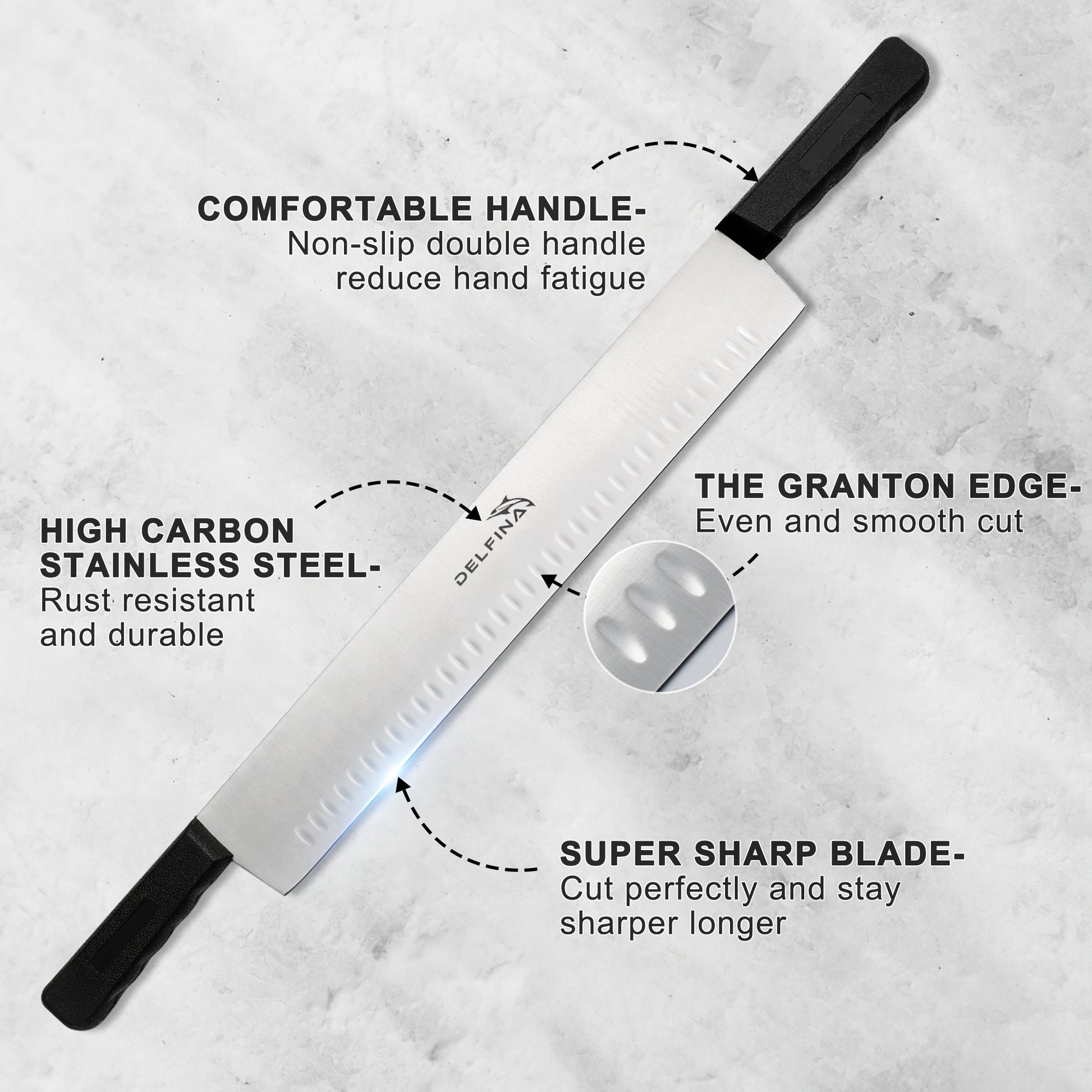 - Non-slip Handles: The non-slip polypropylene handles is dirt-resistant and more easy to clean, ergonomic design help you grip more comfortable. Double handle is perfect for giving you the ability to get leverage over the knife with both hands and easy to cut on the food.