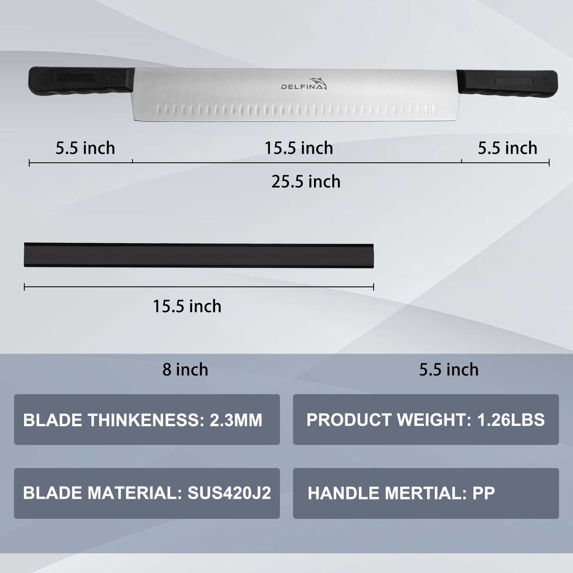 - Size and Tips:Dimesion -25.5"L*2.5"W; it comes with a blade protector. Tips- The balde is sharp, please be careful when use it to ensure safety ; when not in use, please put the knife in the blade guard to store.