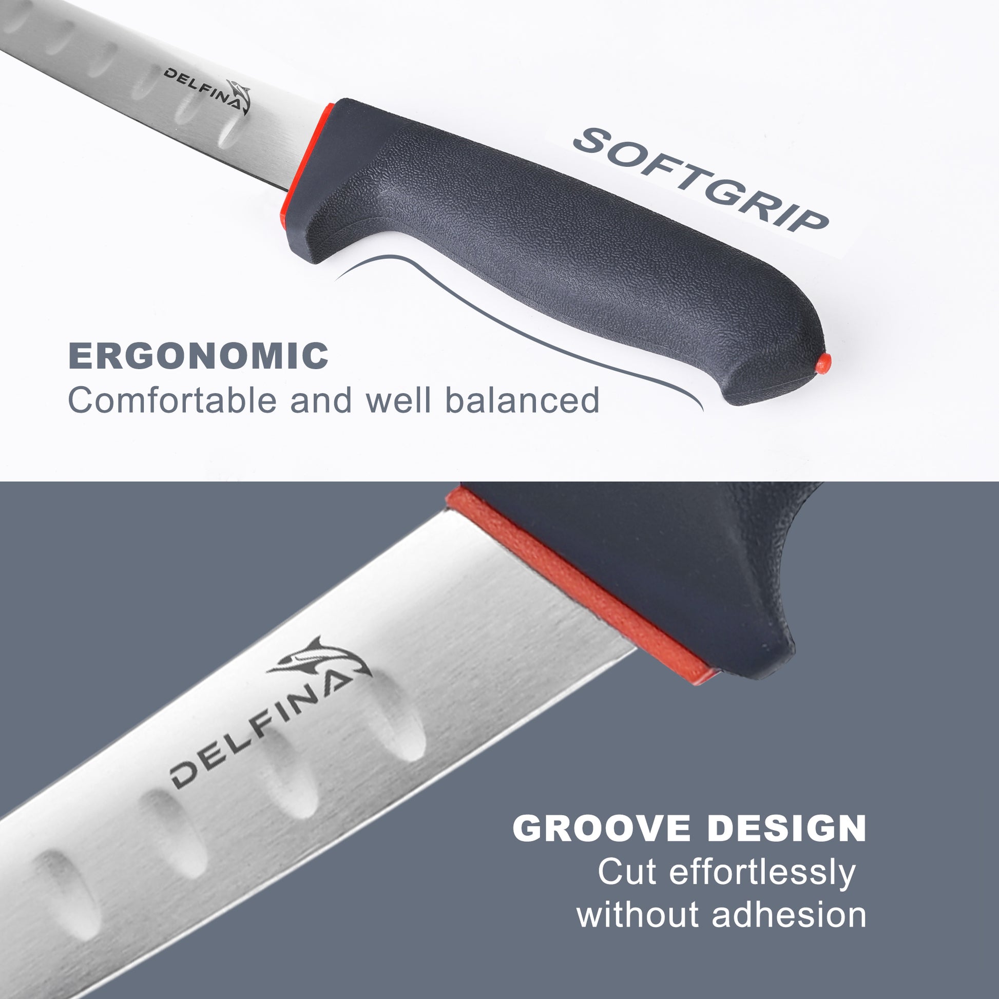 - CONSIDERATE DESIGN - The groove design prevents food from sticking to the blade, slice more easily and evenly. It is designed with a sturdy TPE handle and comfortable anti-slip grip. In addition, plastic handles are less prone to rot and mold than wood handles.
