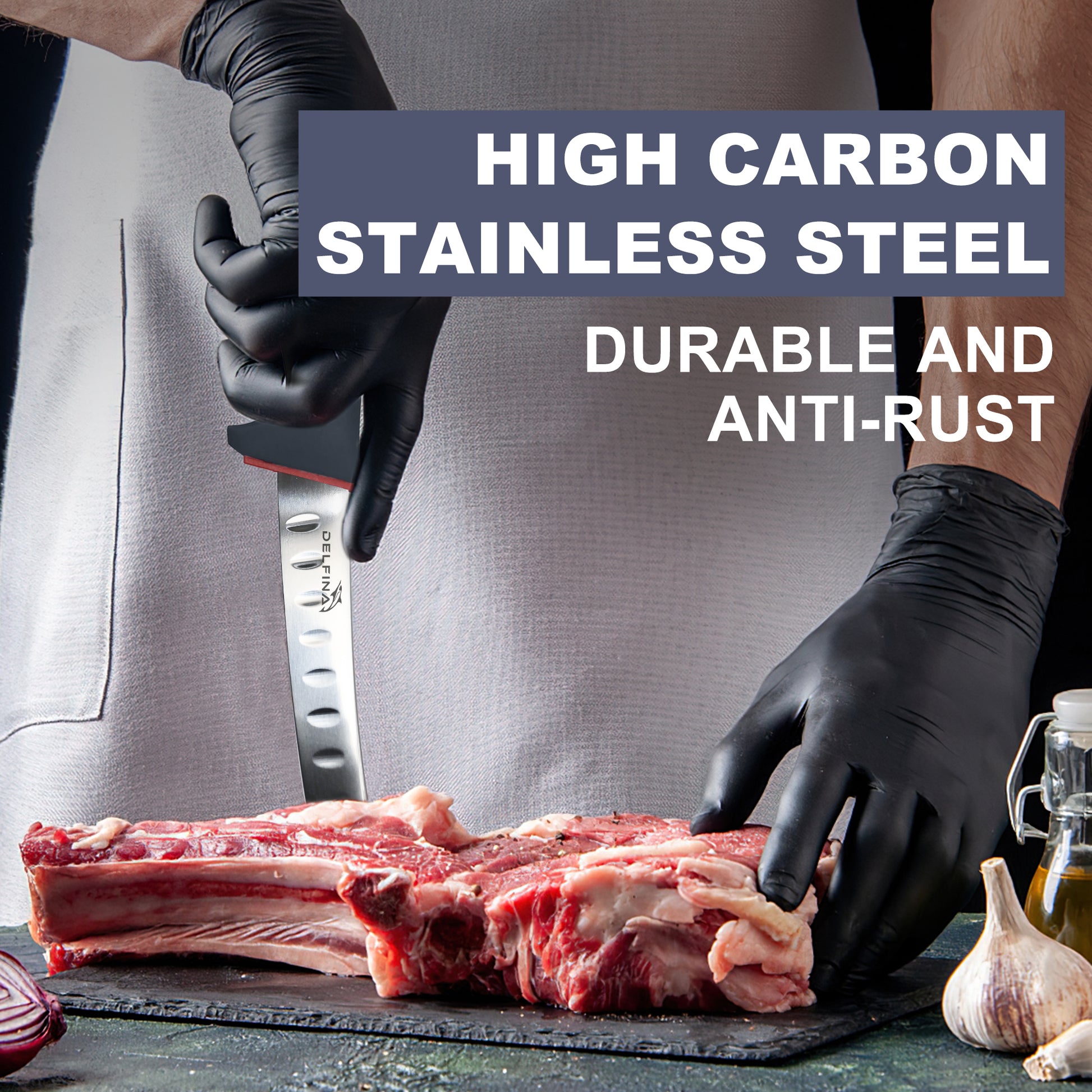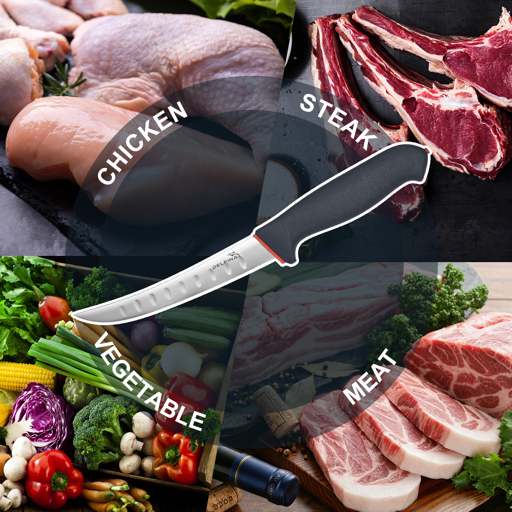 - MULTIPURPOSE - DELFINA BREAKING KNIFE cuts large pieces of meat into smaller pieces and use it to chop ribs, roast, steaks, hams, beef, fish, etc. to trim the fat off the bones efficiently. Our knife offers the good cooking experience for you, whether you are home cook or a professional.