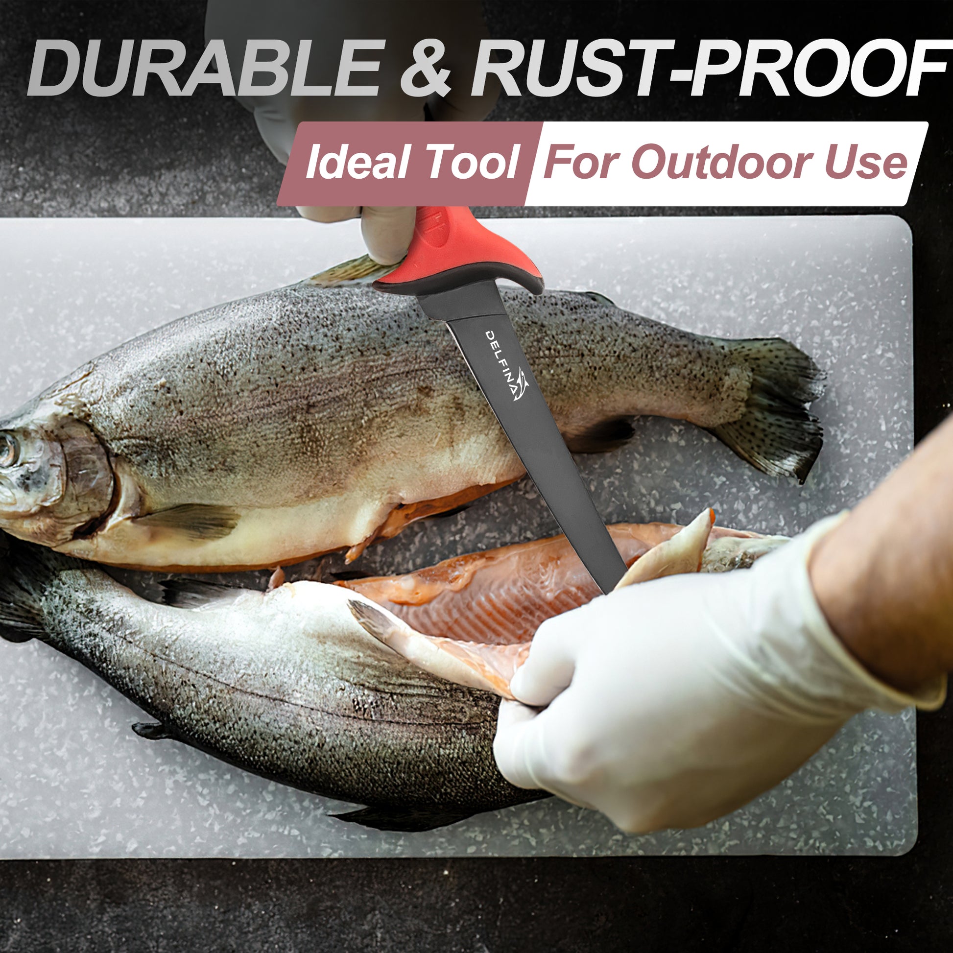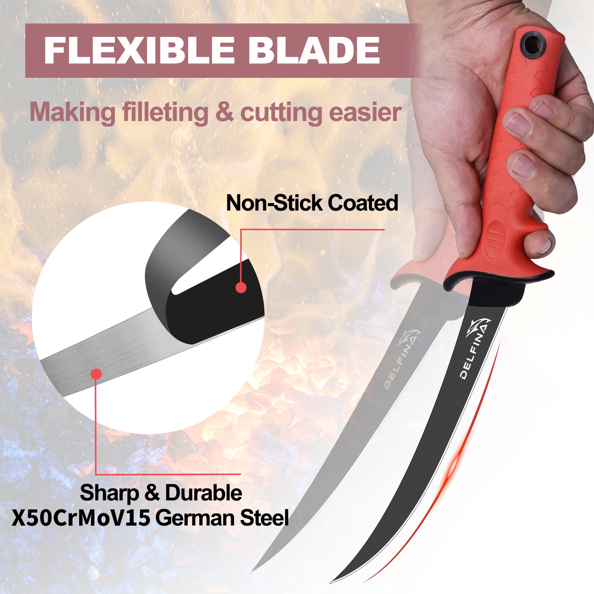 - DELFINA FILLET KNIFE: Blade length 7", razor sharp german steel X50CrMoV15 with a beautiful black finish. The non-stick coating helps the meat slide off easily. The fillet knife can be used for filleting freshwater and saltwater fish.