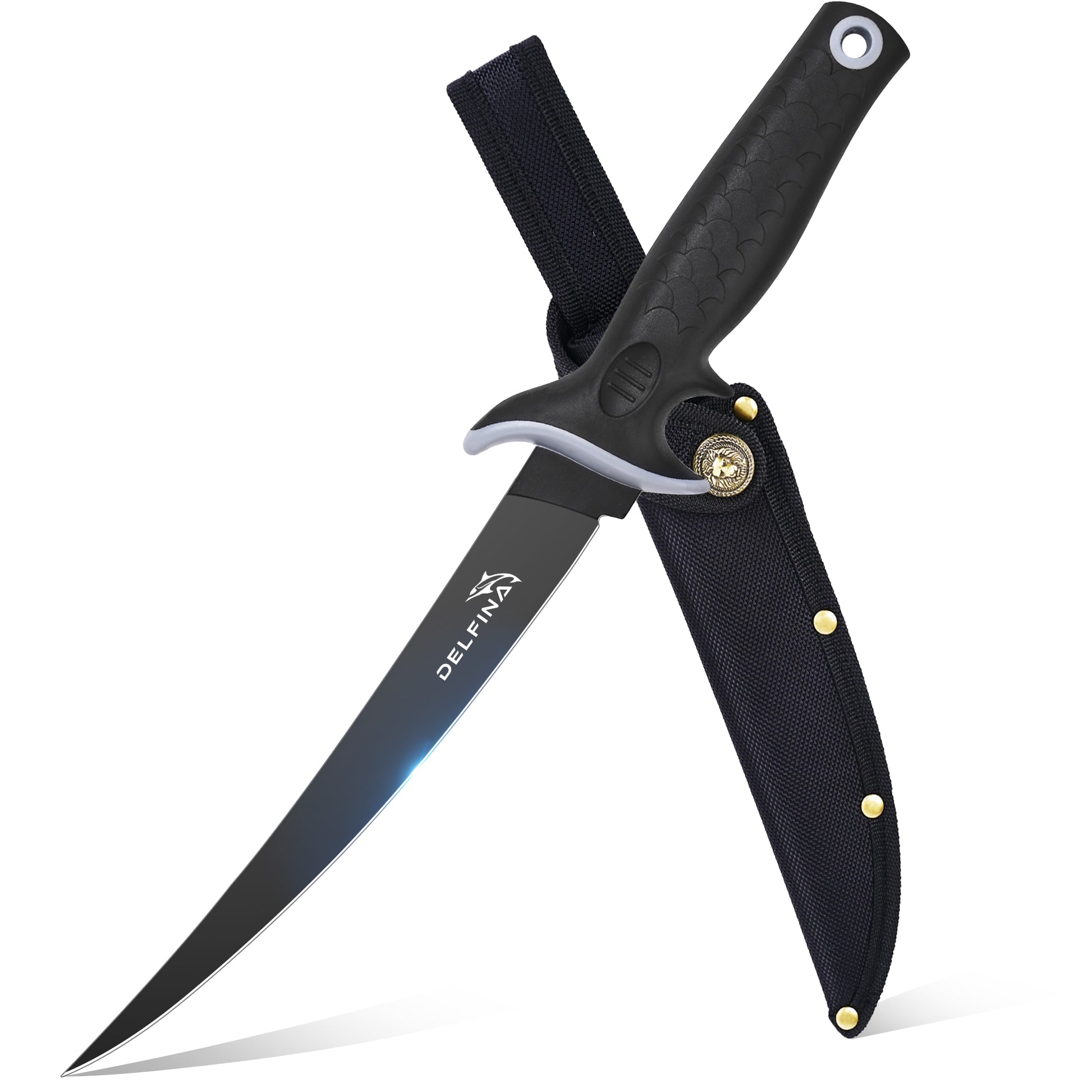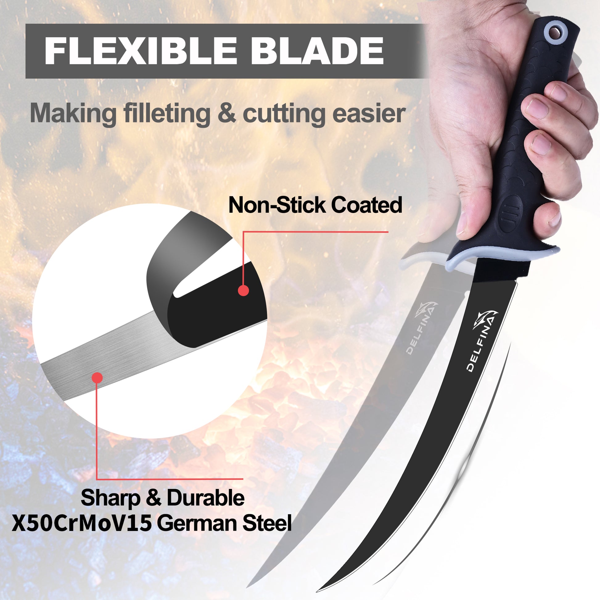 - DELFINA FILLET KNIFE: Blade length 9", razor sharp german steel X50CrMoV15 with a beautiful black finish. The non-stick coating helps the meat slide off easily. The fillet knife can be used for filleting freshwater and saltwater fish.