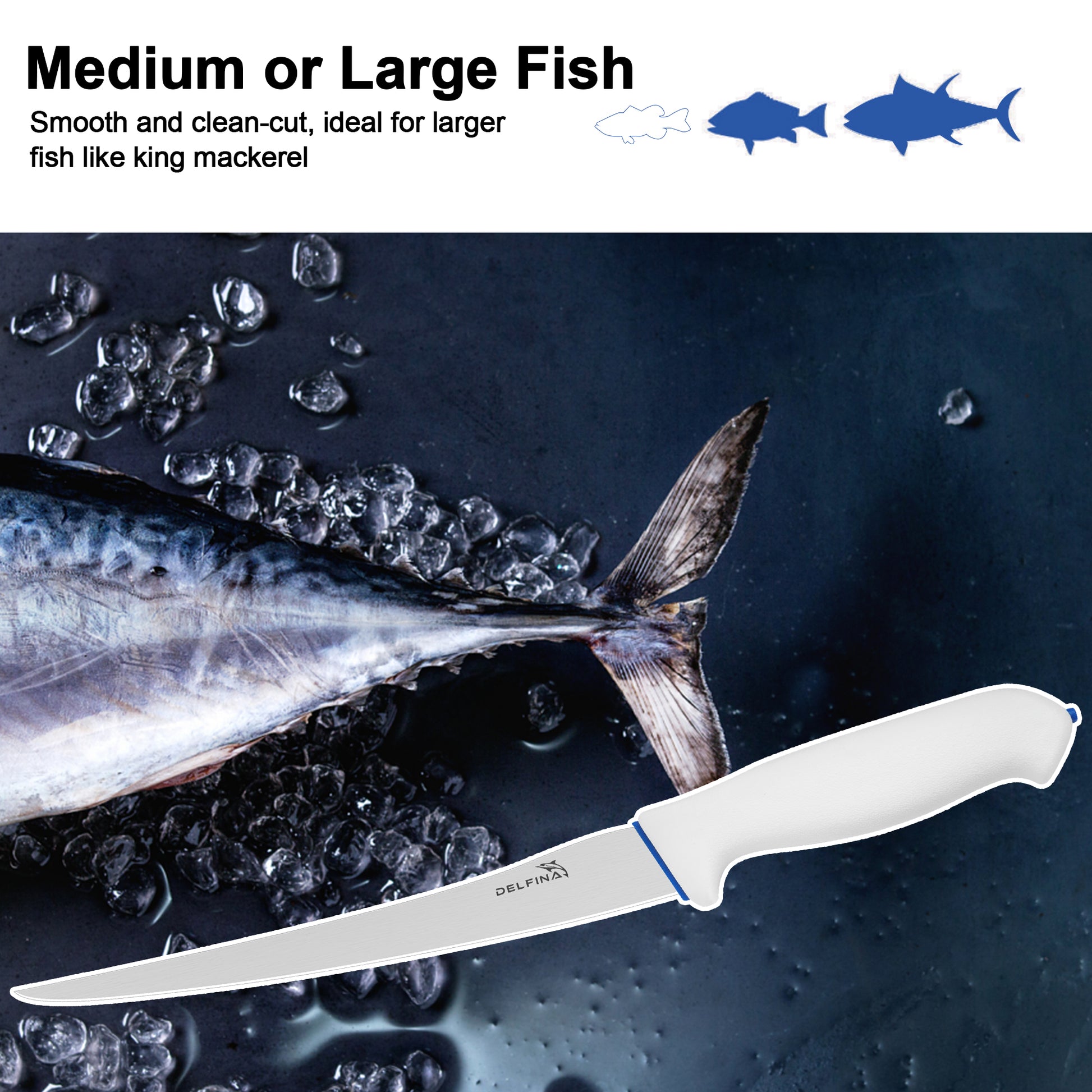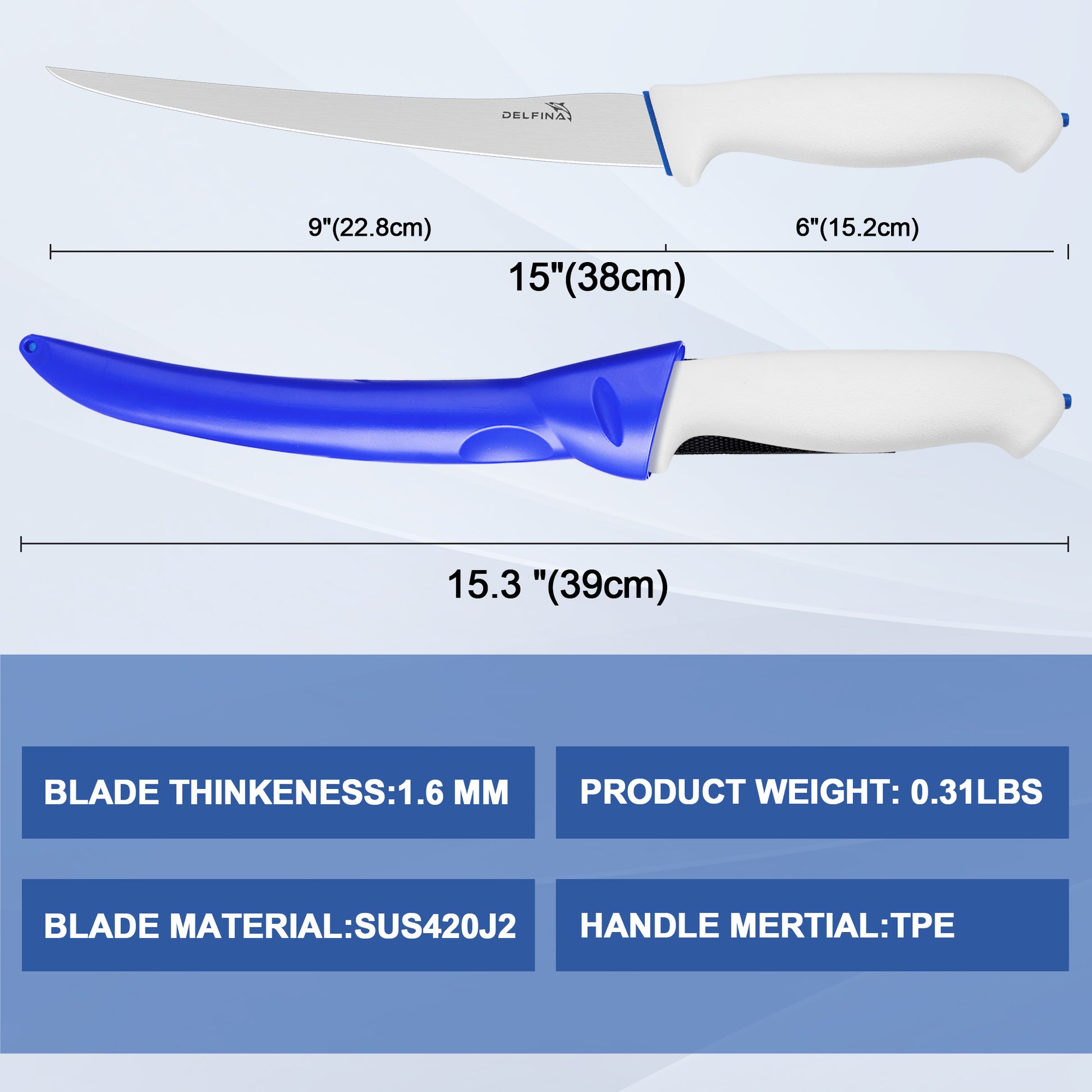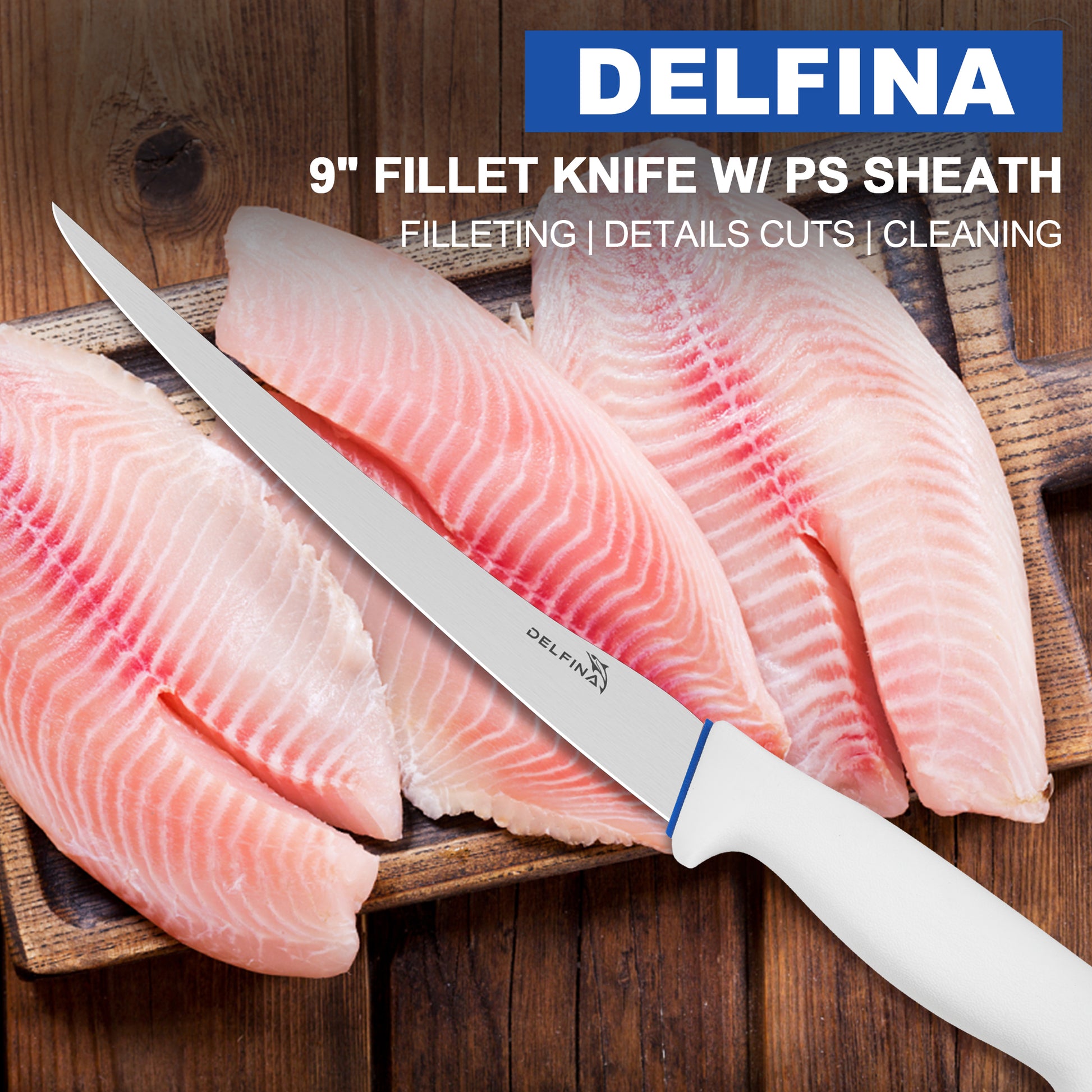 - DELFINA 9" FILLET KNIFE W/ SHEATH ideal fillet knife for your fishing trip; suitable for medium or large fish, such like king mackerel; Blade length 9", total length 14 3/4", Blade thickness 1.6mm.