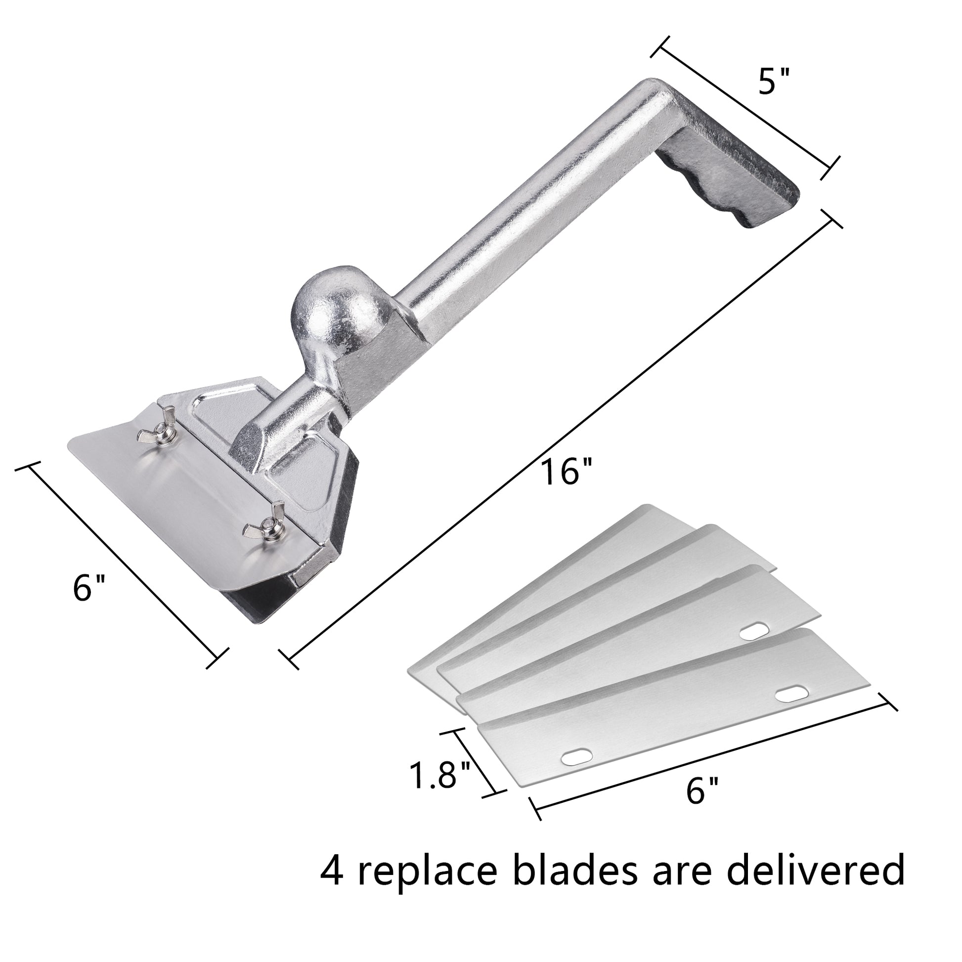 - SPECIFICATION AND NOTES: Grill Scraper:16''L×6''W×5''H, Blade:6''L×1.8''W; it comes with 4 compatible replacement blades which is easy to install with out any tools.NOTES --> The two styles in the picture are shipped at random, only the surface is different, the size and function are the same, both are excellent.