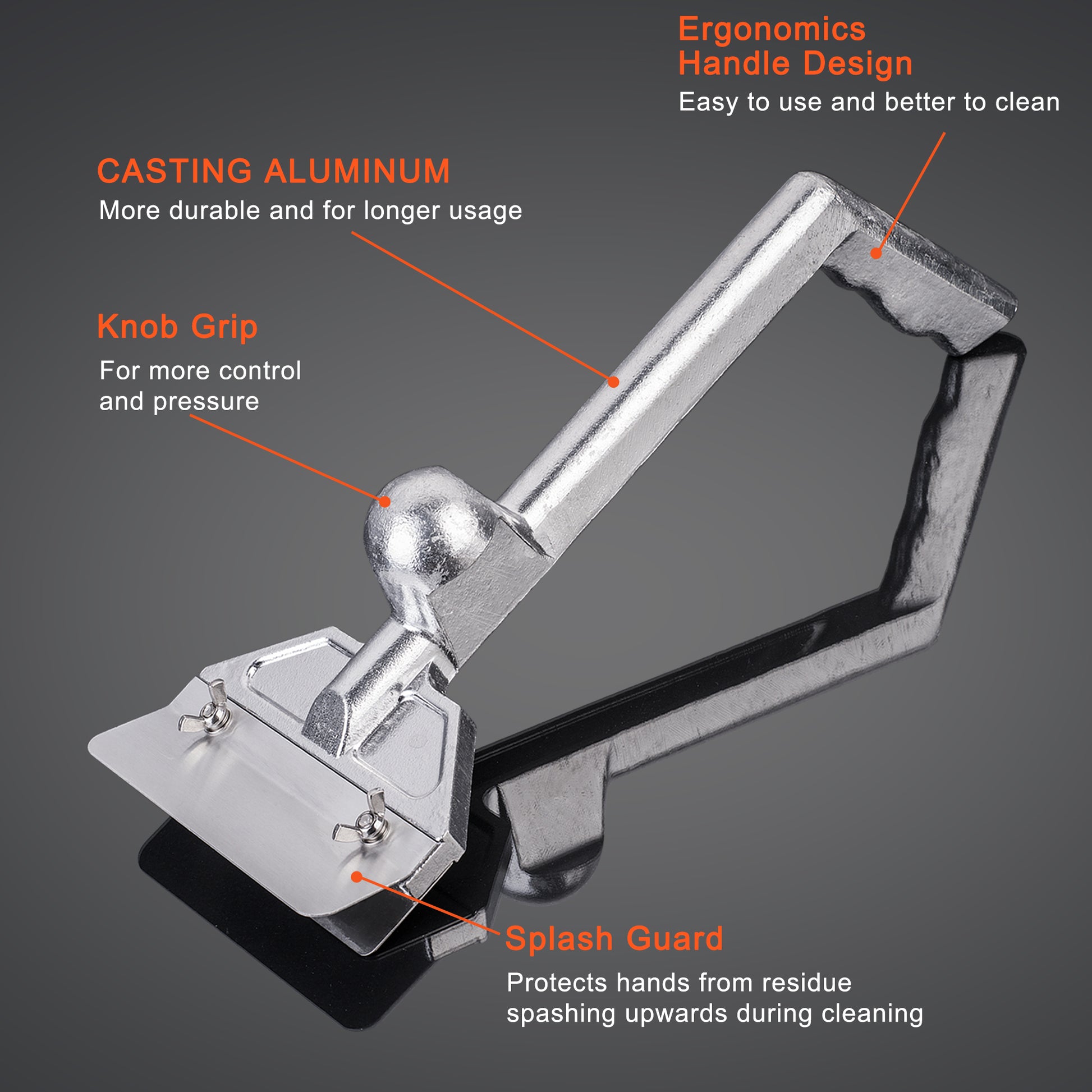 - Easy to use and Effective:The ergonomic handle makes it really easy to use and saves your hands from getting all burnt from cleaning the grill. The knob on the handle helps apply the pressure needed to clean your griddle surface properly and the wide 6" blade makes the job go faster. Grease and residue does get between the blade and handle to prevents residue from splashing upward during cleaning. YES! No more struggling to clean your griddle!