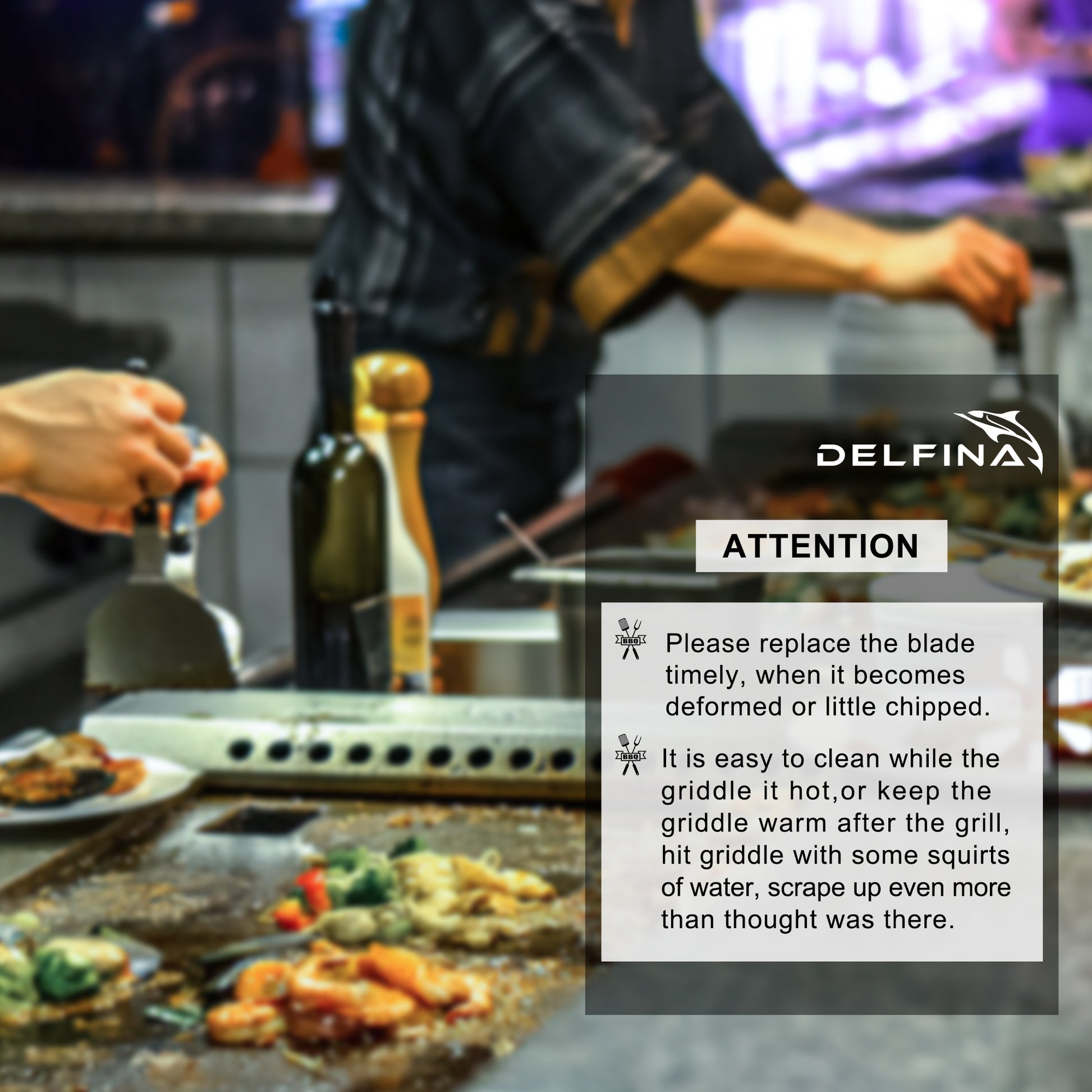 - High Quality Material: DELFINA Grill Scraper is made of heavy-duty cast aluminum construction with 5 smooth blades ( include 4 replacement blades and a installed blade) . The blades are made of high quality stainless steel which import from Japan. The splash guard of the grill scraper prevents residue from splashing upward during cleaning and keeps oil and debris off your hands.